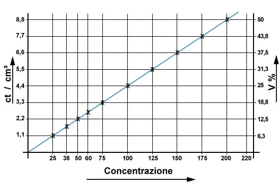 La concentrazione indica la quantità di diamante o di CBN presente nella fascia diamantata ed è uno dei fattori più importanti. Normalmente mole con concentrazioni elevate durano più a lungo in quanto più resistenti all’usura. Il valore base per la concentrazione 100 corrisponde al 25 % del volume della fascia e contiene 4,4 carati di grana per ogni cm3 di fascia (1 carato = 0,2 g). Partendo da questi dati viene generato il seguente grafico: